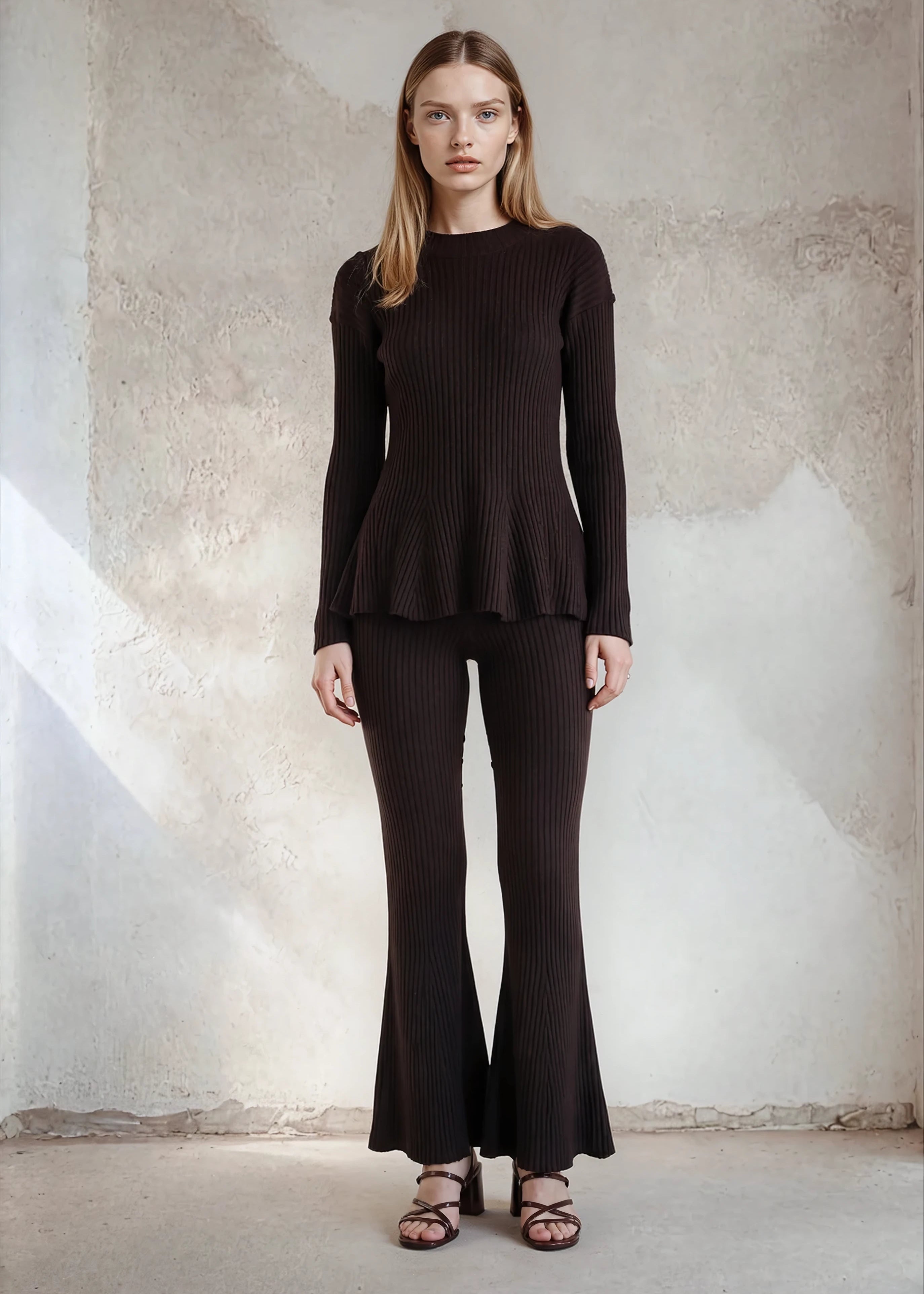 Designed in a refined rib-knit structure, the fabric softly follows the body, creating a naturally sculpted yet effortless fit. The high-rise waist enhances the silhouette, while the flared peplum hem adds fluid movement and quiet drama with every step.The elongated rib effect visually lengthens the legs, creating a sleek, statuesque line. Exceptionally soft against the skin, the pure Mongolian cashmere offers warmth without weight — making this piece as comfortable as it is elevated.A timeless statement designed for sophisticated ease